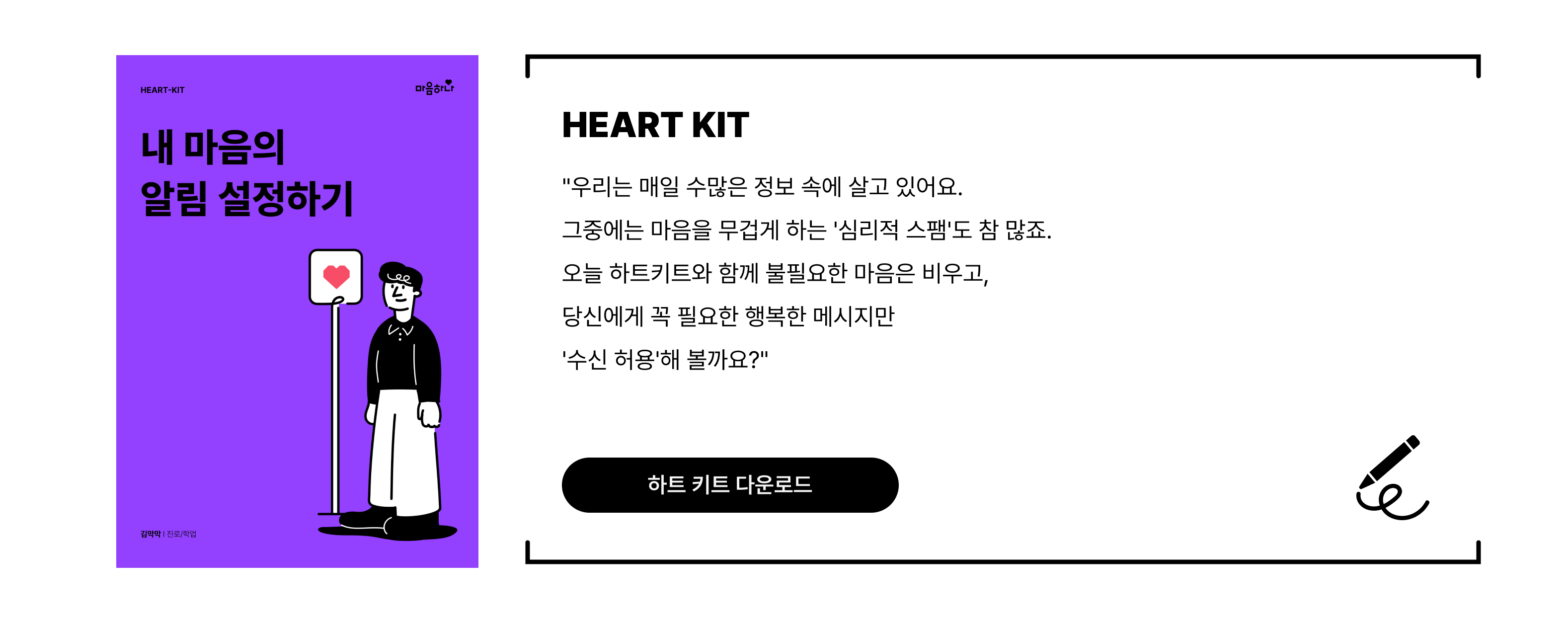 사회의 기준과 타인의 시선을 신경 쓰는 것은 결코 나쁜 일이 아닙니다. 우리는 모두 연결되어 살아가는 사회적 존재니까요. 다만, 그 기준들이 나의 마음을 너무 무겁게 짓누르고 있다면 잠시 내려놓아도 괜찮아요. ‘자기 결정성’은 마치 근육과 같아서 자주 연습할수록 단단해집니다. 처음에는 ‘정말 이렇게 내가 결정해도 괜찮을까?’ 싶어 망설여지겠지만,  아주 작은 일부터 스스로 결정하고 그 결과를 책임지는 연습을 반복해 보세요. 분명 그 경험들이 쌓여 나를 지키는 단단한 근육이 될 거예요.오늘 편지에서 배운 내용을 혼자서도 차근차근 연습할 수 있도록 ‘하트키트(HEART-KIT)’를 준비했어요.  키트를 채워가며 나만의 속도를 찾는 여정을 시작해 보길 응원할게요!